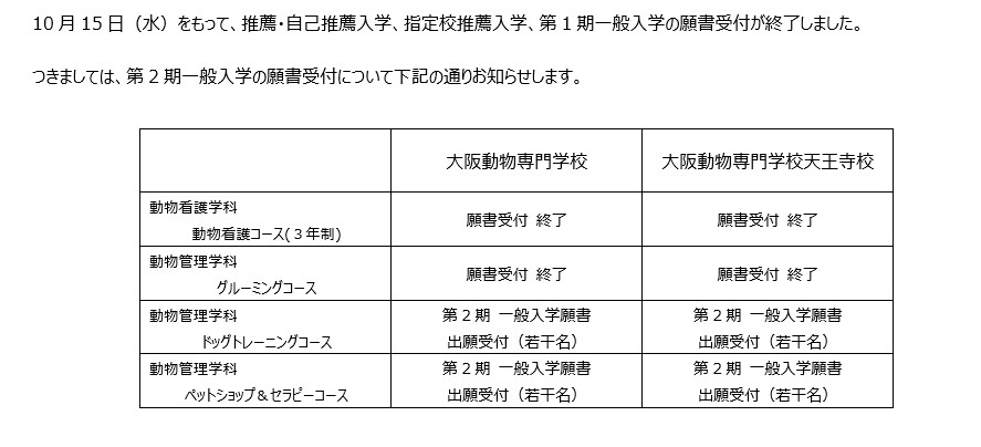 2026年度入学の願書受付について、大阪動物専門学校、大阪動物専門学校天王寺校の両校において、動物看護コースおよびグルーミングコースを終了しました。